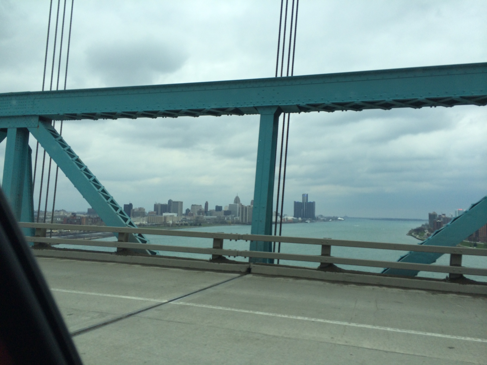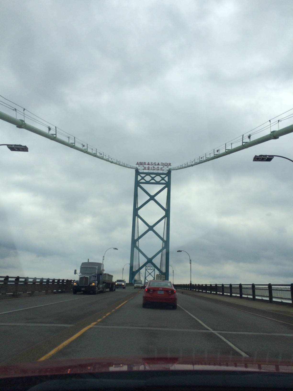 He de decir que hoy hubo varias primeras veces para un servidor, la primera vez de llegar a Detriot en un auto, de verlo a lo lejos, de ir al Duty Free del puente, cruzar el puente y ser entrevistado por un vista Canadiense. La visa nos costó bastante trabajo obtenerla, pero con ella en mano solo fueron necesarios 30 minutos mas de revisiones y sellos para internar los vehículos. También fue la primera vez de manejar en Canadá y tantos kilómetros.