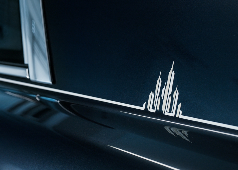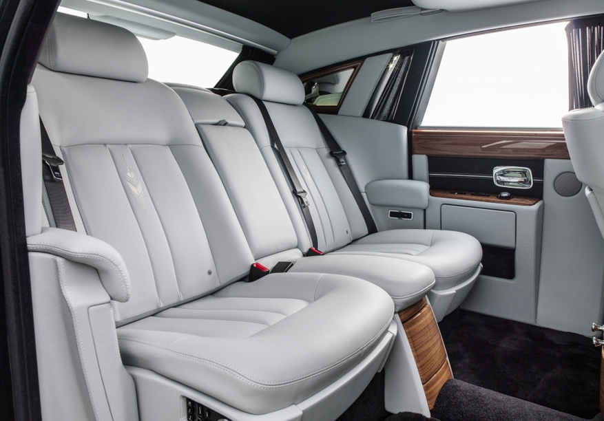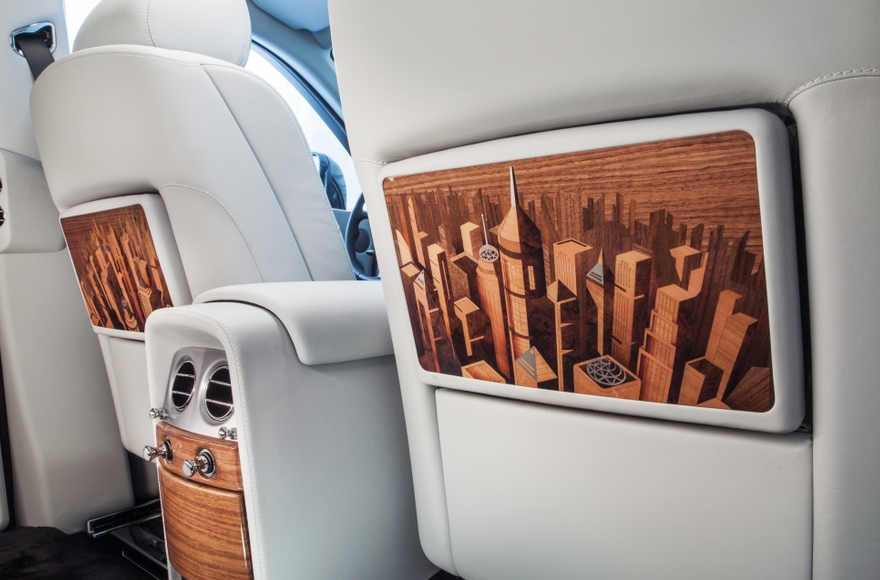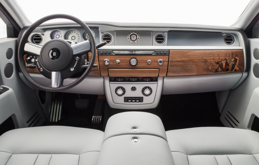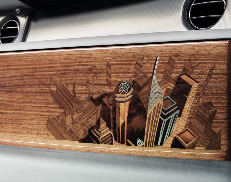 El tema del paisaje urbano se extiende más allá de muchas superficies de madera de Phantom. Una especialmente desarrollado cuero color Aetherius Gris fue creado para hacerse eco de la paleta de colores de la ciudad moderna, mientras que 6.800 puntos de sutura en dos tonos a las flautas de los asientos traseros centrales representar una imagen abstracta de un rascacielos. Un reloj a medida especialmente desarrollado el tema se extiende a la parte delantera del coche. Por primera vez en la historia de la marca, un bisel giratorio expresando 24 de las grandes ciudades del mundo y de sus zonas horarias – París incluido – adornan la consola central de un automóvil Rolls-Royce.