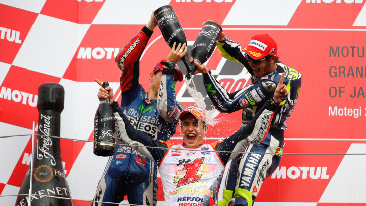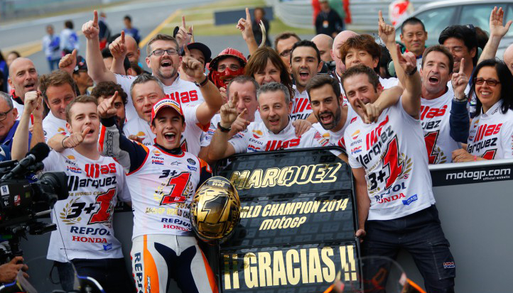 A pesar de que Andrea Dovizioso restara protagonismo a Marc Márquez llevándose la pole para el Gran Premio de Japón y que Jorge Lorenzo arruinara el festejo para el “chamaco” tras hacerse de la bandera a cuadros del circuito Twin Ring Motegi, Marc habría de invitar a la prensa especializada a captar el momento en el que ha asegurado el Campeonato 2014 tras llegar segundo en Japón, y a pesar de que restan aún tres carreras por disputarse.