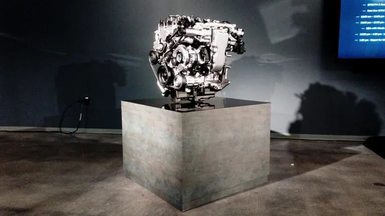 De esta forma, ingenieros de la marca nos mostraron y explicaron su nueva gran apuesta, un motor que combina las ventajas de los motores de gasolina y diésel para lograr un desempeño ambiental sobresaliente y un rendimiento de potencia y aceleración: los beneficios de un motor de gasolina de encendido por chispa (expansividad a altas revoluciones y emisiones de escape más limpias) combinado con los de un motor diésel de encendido por compresión (una respuesta inicial superior y economía de combustible).