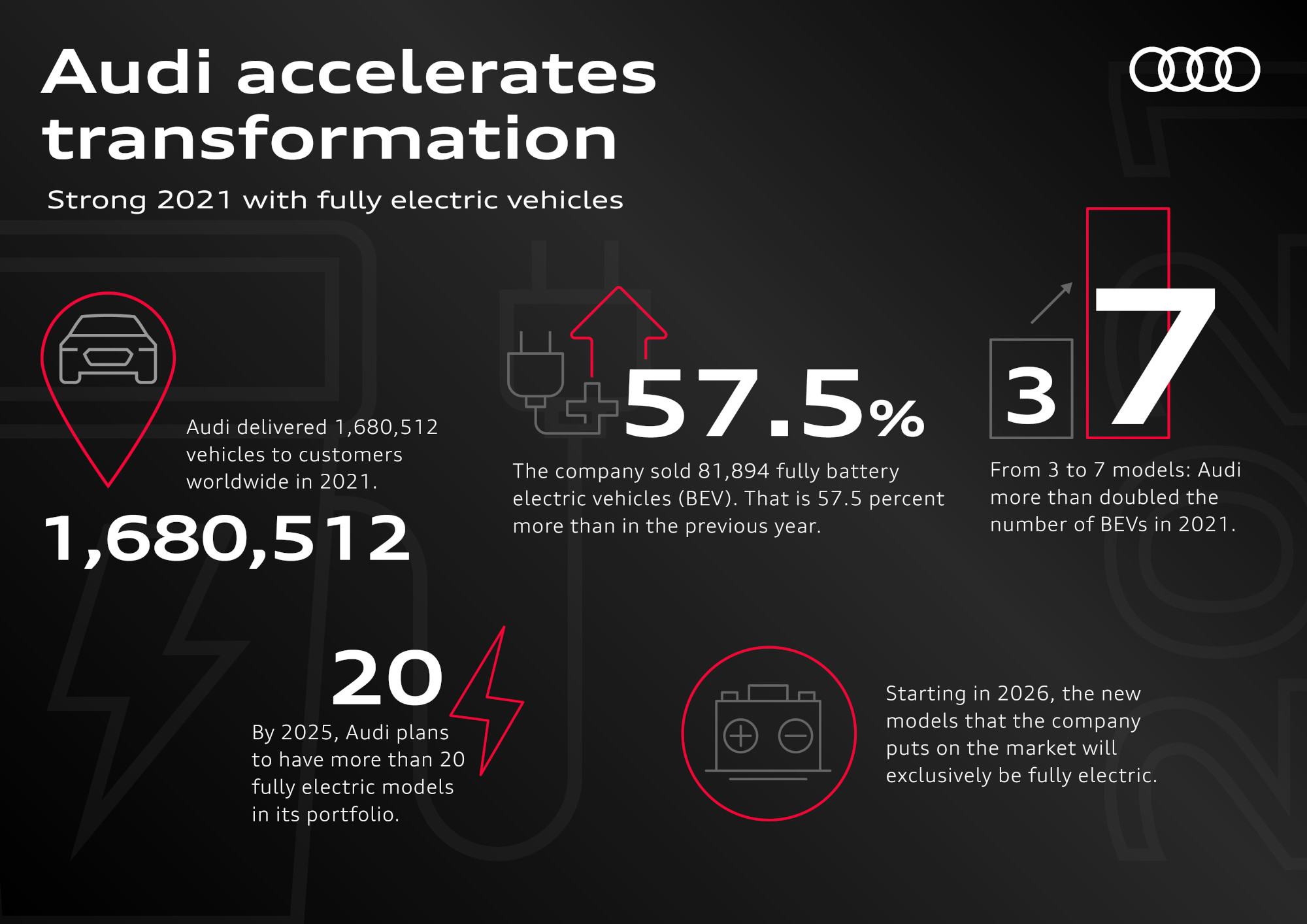 Para 2025 la firma de los cuatro aros planea tener más de 20 modelos totalmente eléctricos. A partir de 2026, la marca sacará al mercado en exclusiva nuevos modelos totalmente eléctricos.