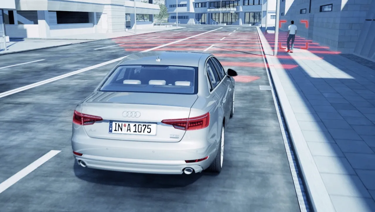 El ingeniero de desarrollo de entornos virtuales de Audi, Andreas Kern, dirige su Audi A6 hacia una intersección vial, con un edificio de muchos pisos bloqueando su visión frontal. De pronto, una doble flecha roja se ilumina en la instrumentación, acompañada por una insistente señal sonora. El auto advierte de esta forma al conductor de un peligro potencial: aunque aún no está visible para el ojo humano, los sensores de radar han identificado un auto que se aproxima a la intersección por detrás del edificio. El Audi puede comenzar a frenar con mucho tiempo de antelación, y prevenir un accidente.