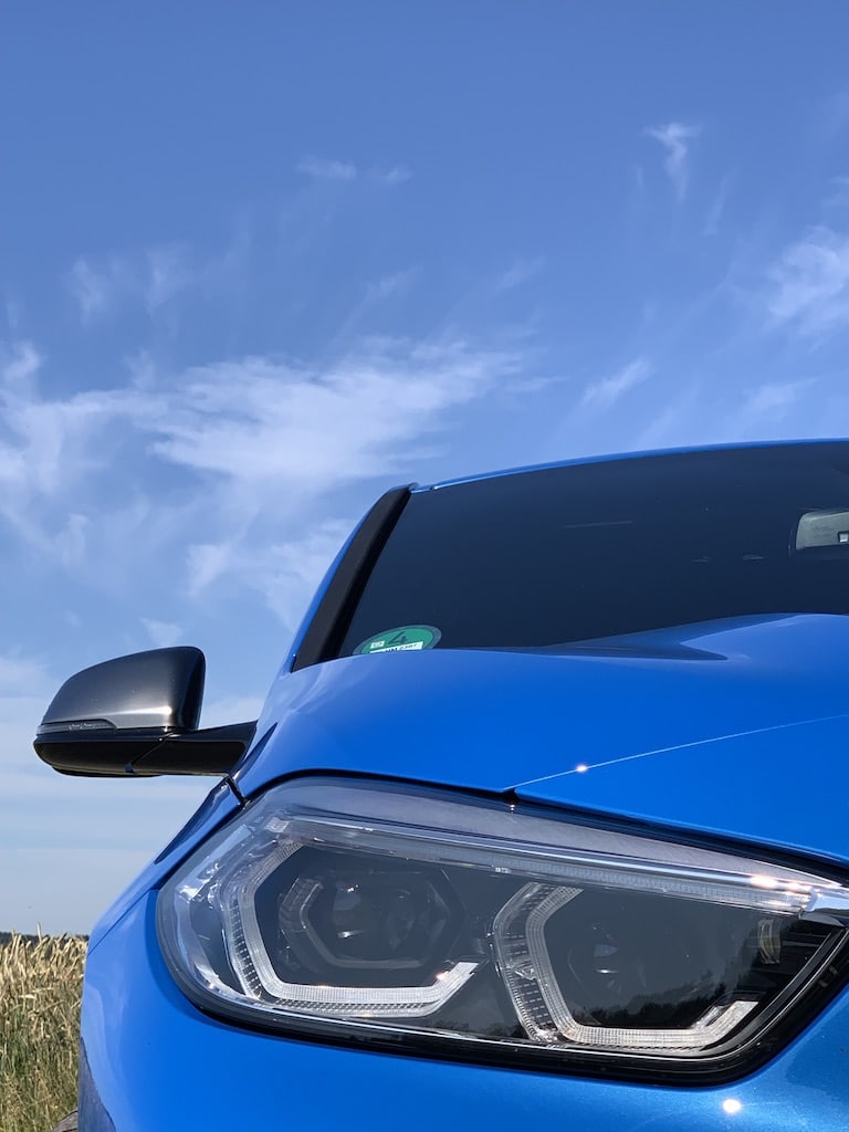 Como esta Serie 1 es la más nueva, pues también lleva equipos que este año están siendo el estándar de la industria. Mírelo, vea las fotos, si lo ve de perfil poco parece un BMW, sin embargo, hay claves que nos indican que es, como el lateral de los faros, su antena de tiburón o su poste C, pero la innovación es que realmente parece que va a saltar, no solo que va hacia adelante. Mire las láminas laterales, las líneas de acento empiezan a ser muy fuertes y las salpicaderas son de las más arriesgadas que hemos visto en BMW, de entrada, lo dejaron tan juvenil que tiene entradas de aire en los costados delanteros y traseros, sí véalo de frente y se notan a los lados, una gran parrilla que lleva un solo marco, con la tendencia a crecerla y los faros a delinear cuatro cuerpos, pero solo delinearlos.