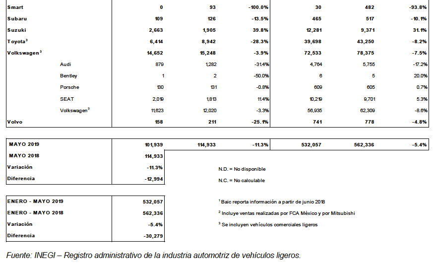 En el acumulado enero- mayo 2019 se registraron 532,057 vehículos ligeros vendidos, lo que representa una caída de 5.4% en relación al mismo periodo del 2018 en el que se comercializaron 562,336.
