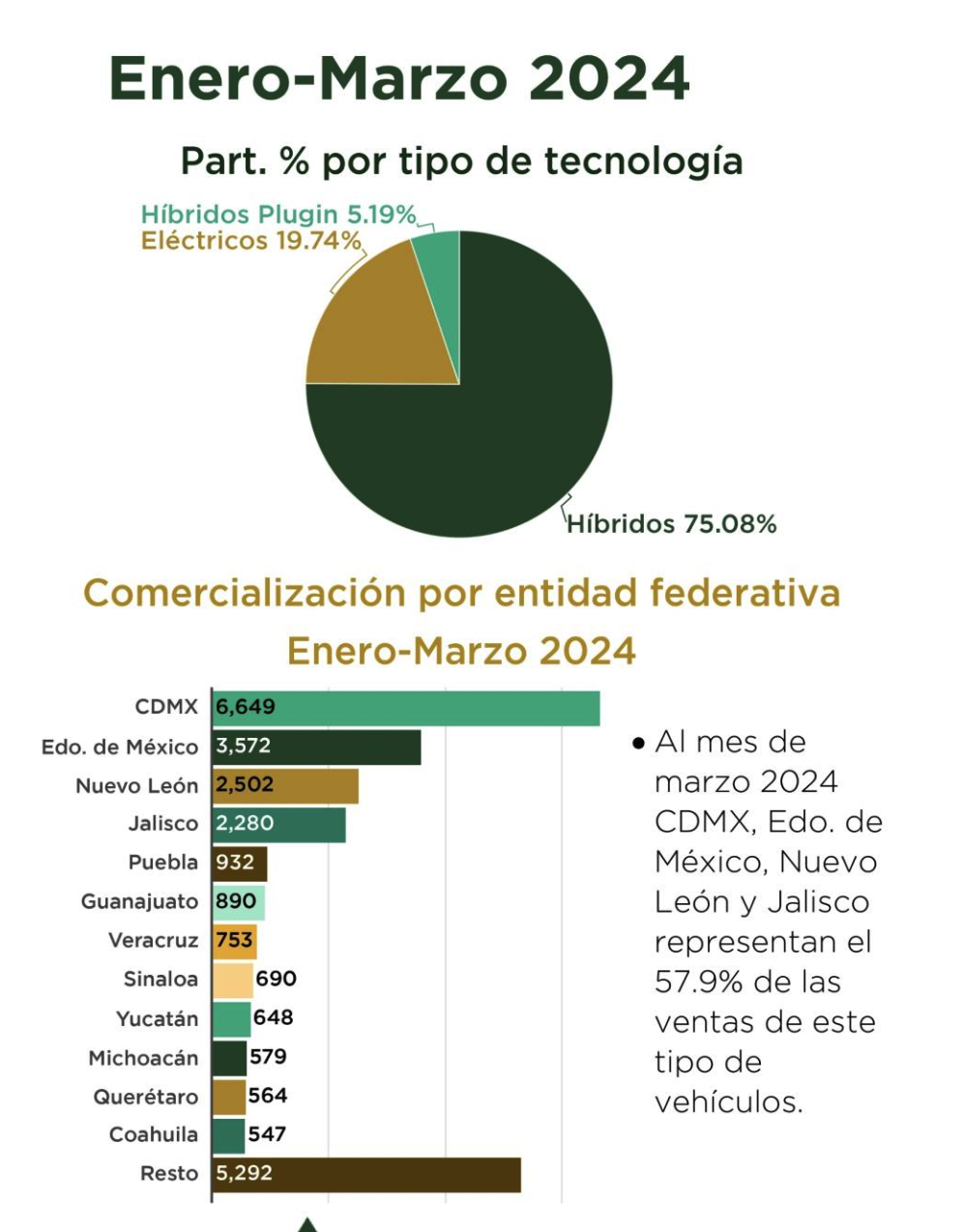 En México durante el primer trimestre del año creció la venta de vehículos electrificados 86.8% y de 2021 a 2024 se ha triplicado el volumen de estos con respecto al año pasado. Las entidades con más venta de híbridos son Ciudad de México en primer lugar, Estado de México en segundo, Nuevo León en tercer lugar, Jalisco en cuarto, Puebla quinto y Guanajuato el sexto lugar.