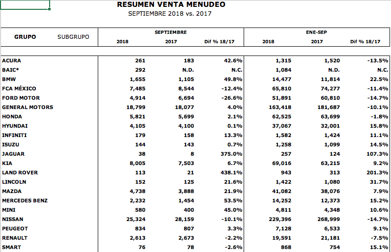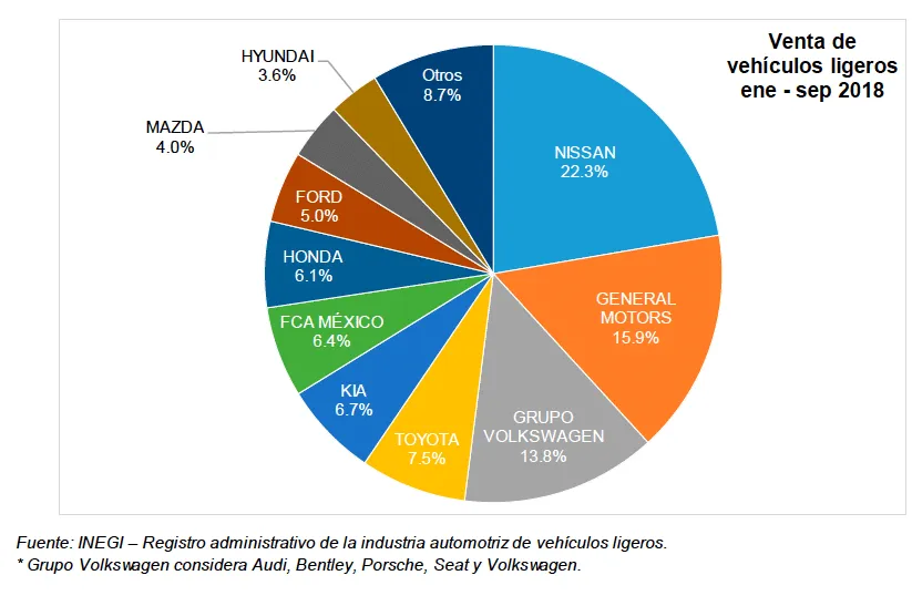Nissan conserva su posición de líder con el 22.3% General Motors se mantiene en la segunda posición en las ventas con el 15.9 por ciento.Grupo Volkswagen en el tercer puesto con el 13.8 por ciento. Les siguen en el cuarto lugar Toyota con el 7.5%, KIA con el 6.7%, FCA México se ubica en la sexta posición con 6.4%, en el séptimo Honda con el 6.1%, Ford se mantiene con un 5.0%, Mazda con 4.0%, Hyundai con el 3.6% y otros se reparten el 8.7 por ciento.