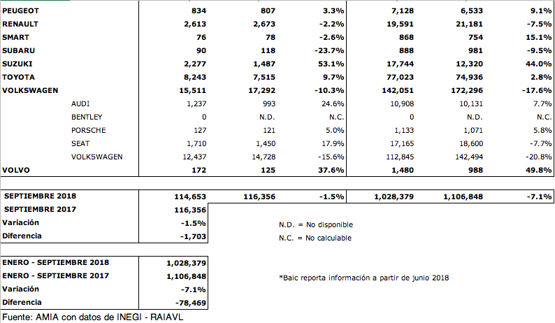 De acuerdo con las cifras publicadas por el INEGI, durante septiembre 2018 la venta de vehículos ligeros fue de 114,653 unidades, 1.5% inferior a las unidades comercializadas en el mismo mes del año pasado. En el acumulado enero – septiembre 2018 se registraron 1,028,379 vehículos ligeros vendidos, registrando una caída de 7.1% en relación al acumulado del mismo periodo del año previo.