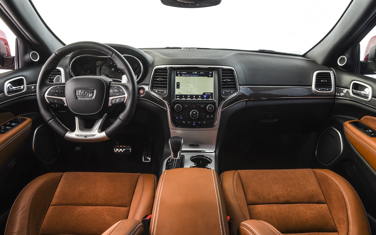 El interior está centrado en el conductor: panel de instrumentos de 7 pulgadas con tacómetro en el centro y velocímetro de 320 km/h; pantalla táctil de 8.4 pulgadas con Trackhawk Performance Pages.