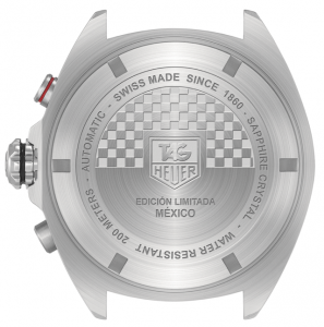 Así pues nos llega esta pieza limitada a 300 ejemplares y de venta exclusiva en territorio mexicano, un F1 de caja de acero inoxidable, brazalete y animado con un movimiento mecánico de remonte automático, y en cuanto a la estética, presenta una carátula color negro con totalizadores destacados en blanco para la indicación de los segundos a las 9h, contador de minutos a las 12, de 12 horas a las 6 y apertura para el fechador en punto de las 3 horas. Asimismo el bisel presenta una escala taquimétrica a fin de contabilizar la velocidad promedio de cuerpos en movimiento y, sin lugar a dudas el detalle más importante son las «racing stripes» que parten la carátula de la 1 a las 5 horas en vivos ad-hoc a la bandera mexicana, que coincide con los colores de la marca.