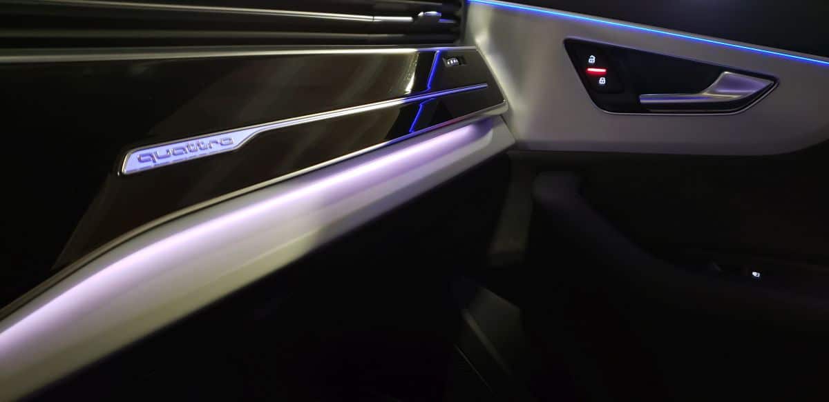 Al interior, destaca naturalmente el Audi Virtual Cockpit (clúster digital) configurable al gusto del conductor y muchos insertos en piano black magníficamente logrados. Al centro del tablero, una pantalla touchscreen desde donde manejamos todo el sistema MMI con sonido Bang & Olufsen (hay opción a un sonido de la misma marca pero con mejor desempeño) y la conectividad (Android & Apple) Debajo de esta, encontramos otra pantalla similar únicamente para controlar todo el sistema de aire acondicionado. Cuenta con múltiples modos de iluminación interior, lo que en conjunto hace que se perciba un ambiente elegante.
