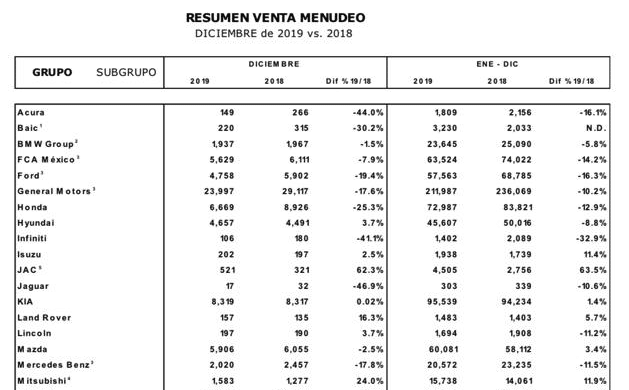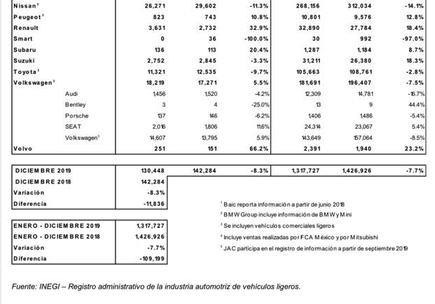 Al cierre de diciembre se comercializaron 130,448 unidades, cifra 8.3%% inferior a las unidades comercializadas en el mismo mes del año pasado. Por otra parte, en el acumulado enero–diciembre 2019 se registraron 1,317,727 vehículos ligeros vendidos. Lo anterior representa una caída de 7.7% en relación con el mismo periodo del 2018 cuando al último mes del año se habían vendido 1,426,926 vehículos. La diferencia es de 109,199 unidades.
