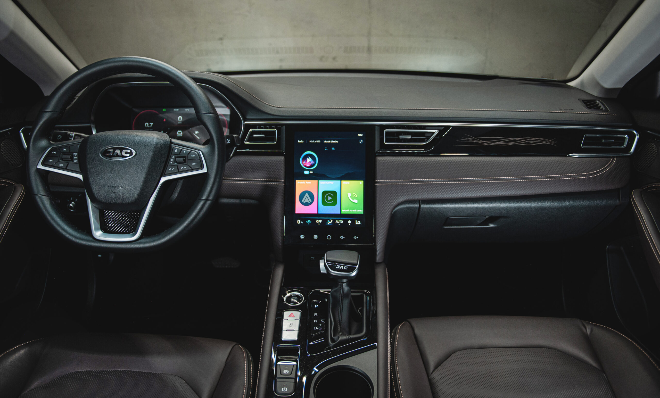 El interior de JAC J7 se define por su alta tecnología, porta una pantalla multimedia vertical de 10.4” con Android Auto y Apple CarPlay; así como cluster digital de 10” LCD, mandos de audio al volante, luz ambiental personalizable con opción de 64 colores diferentes, 8 bocinas y 4 entradas USB.