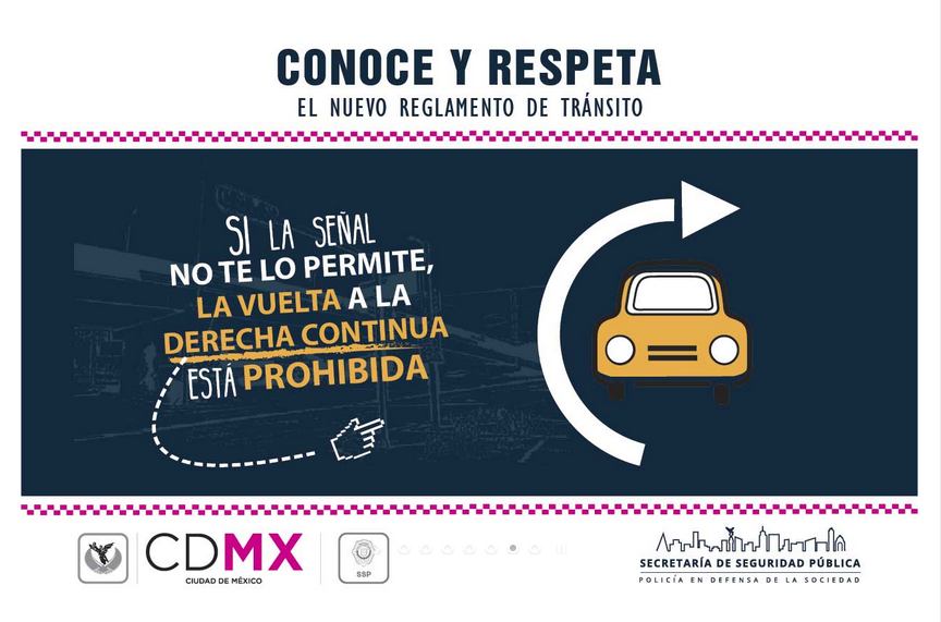 Es importante tomar en cuenta que la vuelta continua a la derecha e izquierda está prohibida, excepto cuando exista un señalamiento que lo permita, en cuyo caso deberá cederse el paso a los peatones que estén cruzando y a los vehículos que transiten por la vía a la que se pretende incorporar, no cumplir con esta disposición será motivo de una multa de aproximadamente 1,398 pesos.