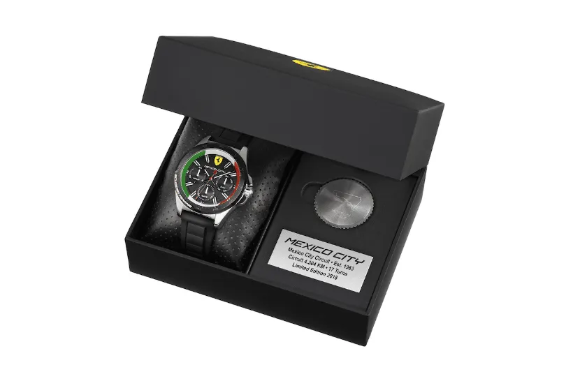 Sin duda un ejemplar así, conmemorando este año, la carrera en el Autódromo de la Ciudad de México y un diseño único eleva la emoción de cualquier aficionado a las carreras, la Fórmula 1 o el honor de ser mexicano. Se presenta en un estuche especial que además trae un medallón con el grabado de la pista del autódromo y una placa con la longitud de 4,304 km; el número de curvas que tiene 17 y la inscripción de edición Limitada: 2018.