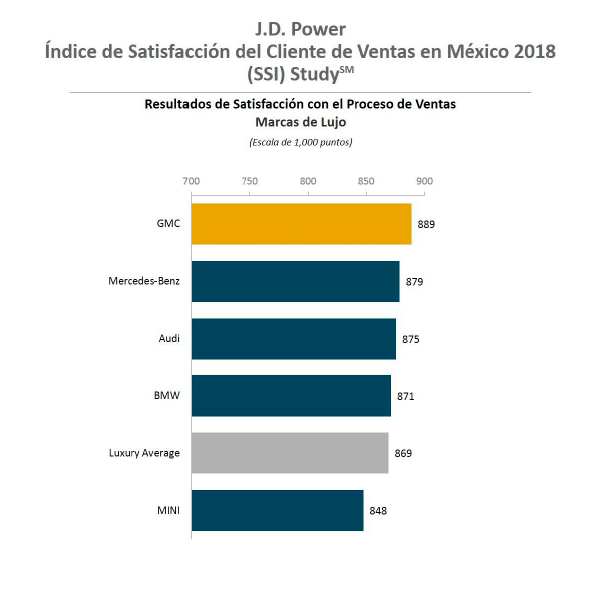 Este año, GMC obtuvo la puntuación más alta para las marcas de lujo, con un índice de satisfacción de 889. Mercedes-Benz se colocó en segundo lugar con un índice de 879, seguida de Audi (875).