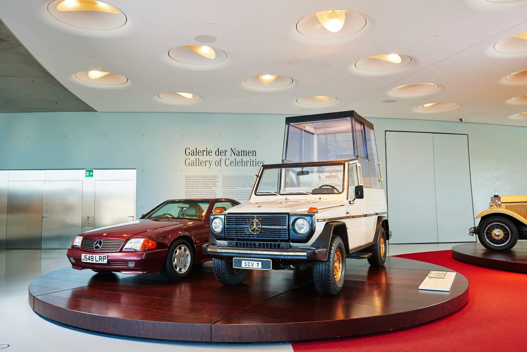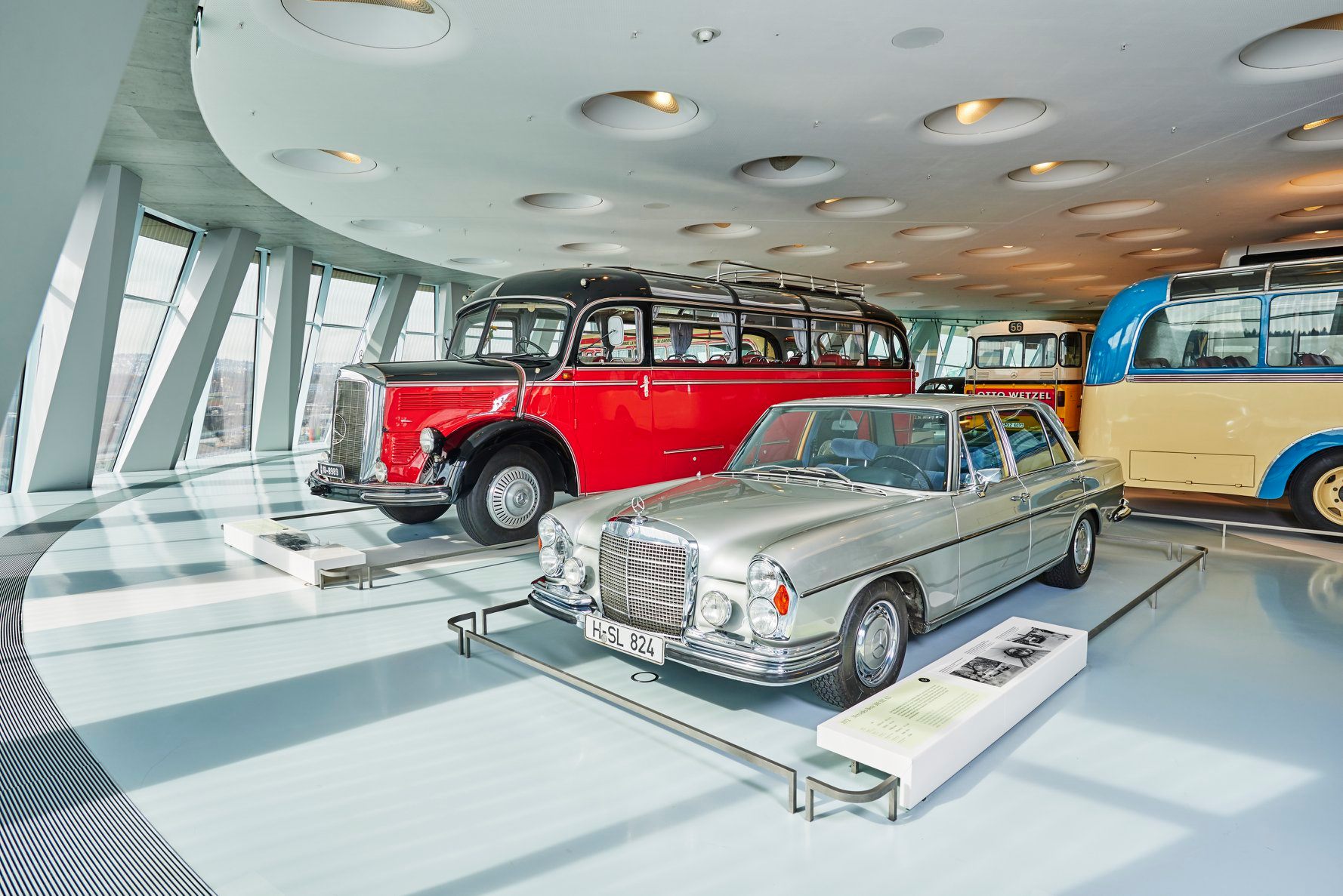 Los recorridos nos conducen por amplias curvas a lo largo de la extensa exposición permanente que, sin embargo, cambia algunos de los vehículos exhibidos a fin de que cada visita sea única, si es que se desea recorrer más de una vez. El recorrido a través de las siete salas relata la historia de la marca en orden cronológico a partir de la invención del automóvil en el año 1886. El segundo recorrido presenta los vehículos ordenados por temas, sin distinción de épocas y agrupados en cinco salas de colecciones. Los visitantes pueden pasar en cualquier momento de un recorrido a otro y conocer así todo el museo. Mientras que destacamos la sala 7 con las míticas Flechas de Plata y el área dedicada a las carreras y a los récords que ha conseguido la firma en deporte motor, todo gracias a una exposición espectacular de autos puestos sobre una curva peraltada.
