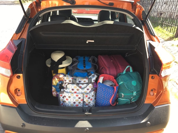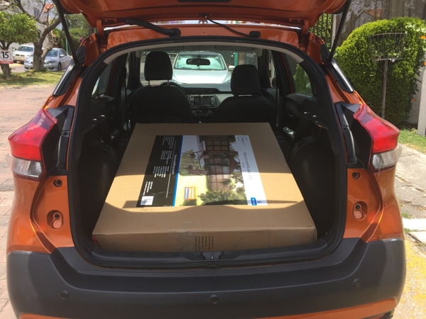 La cajuela del Nissan KICKS es uno de sus puntos más destacables, la capacidad de carga es muy buena, y al abatir los asientos esta mejora aún más, algo que realmente se agradece. Debo decir que el espacio para los ocupantes en la parte trasera sí se ve un poco sacrificado por la silla del bebé, así que diría que, cómodos, pueden viajar tres adultos y… la bebé.