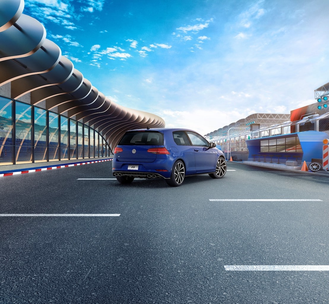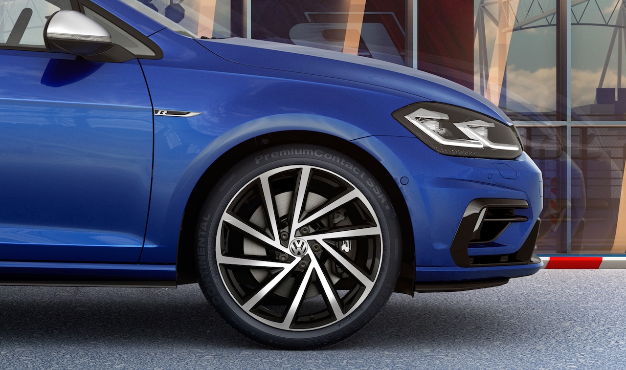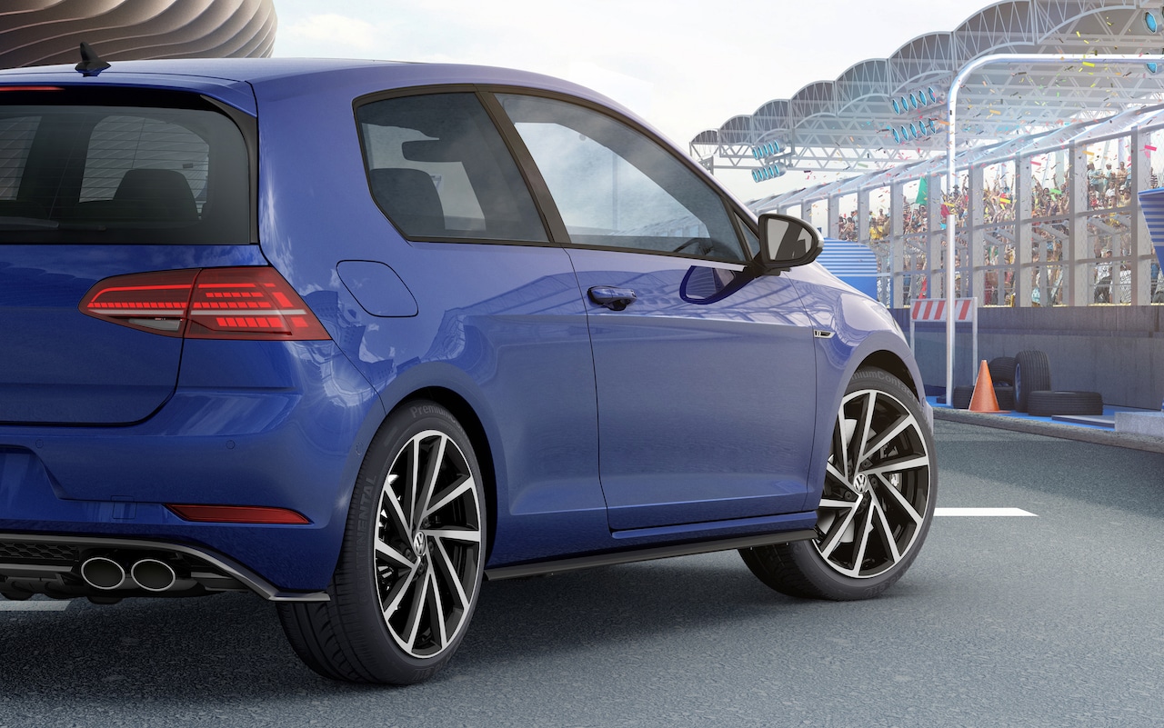 Golf R está diseñado para acelerar el pulso; a simple vista destaca por la presencia de los emblemas exteriores del logo R sobre la tapa trasera, laterales y parilla superior deportiva, destacan también las fascias y estribos laterales deportivos, salida cuádruple de escape cromada, calaveras LED y faros Full LED, calipers de freno pintados en negro, espejos laterales con acabado aluminio, ventanas traseras oscurecidas, techo panorámico con ajuste de altura y rines de aluminio de 19 pulgadas “Spielberg”.