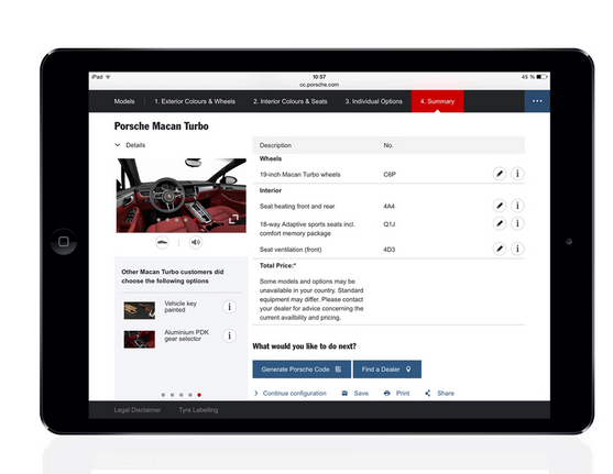 Asimismo, la configuración de un auto tarda en promedio 16 minutos y, posterior a ello, el cliente podrá observar su vehículo en ángulos de 360 grados, lo cual –rápidamente– guiará al siguiente paso: hacerse de un Porsche desde su teléfono, tableta o dispositivo electrónico.