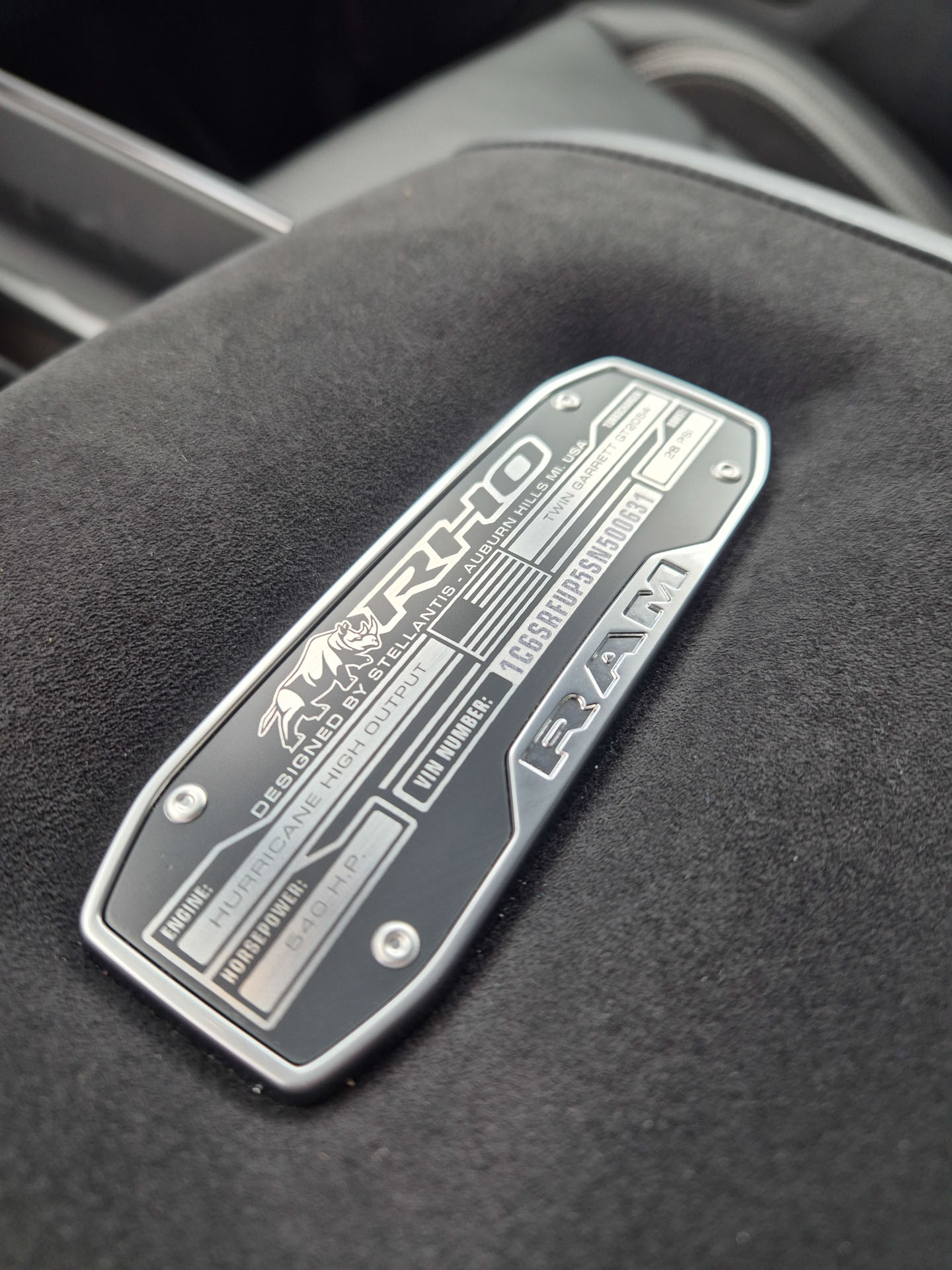 En la codera central, al igual que en TRX, encontramos una placa con el número de serie, tipo de motor, potencia y el distintivo RHO. En los asientos forrados en piel, encontramos el distintivo RHO, así como en tablero.
