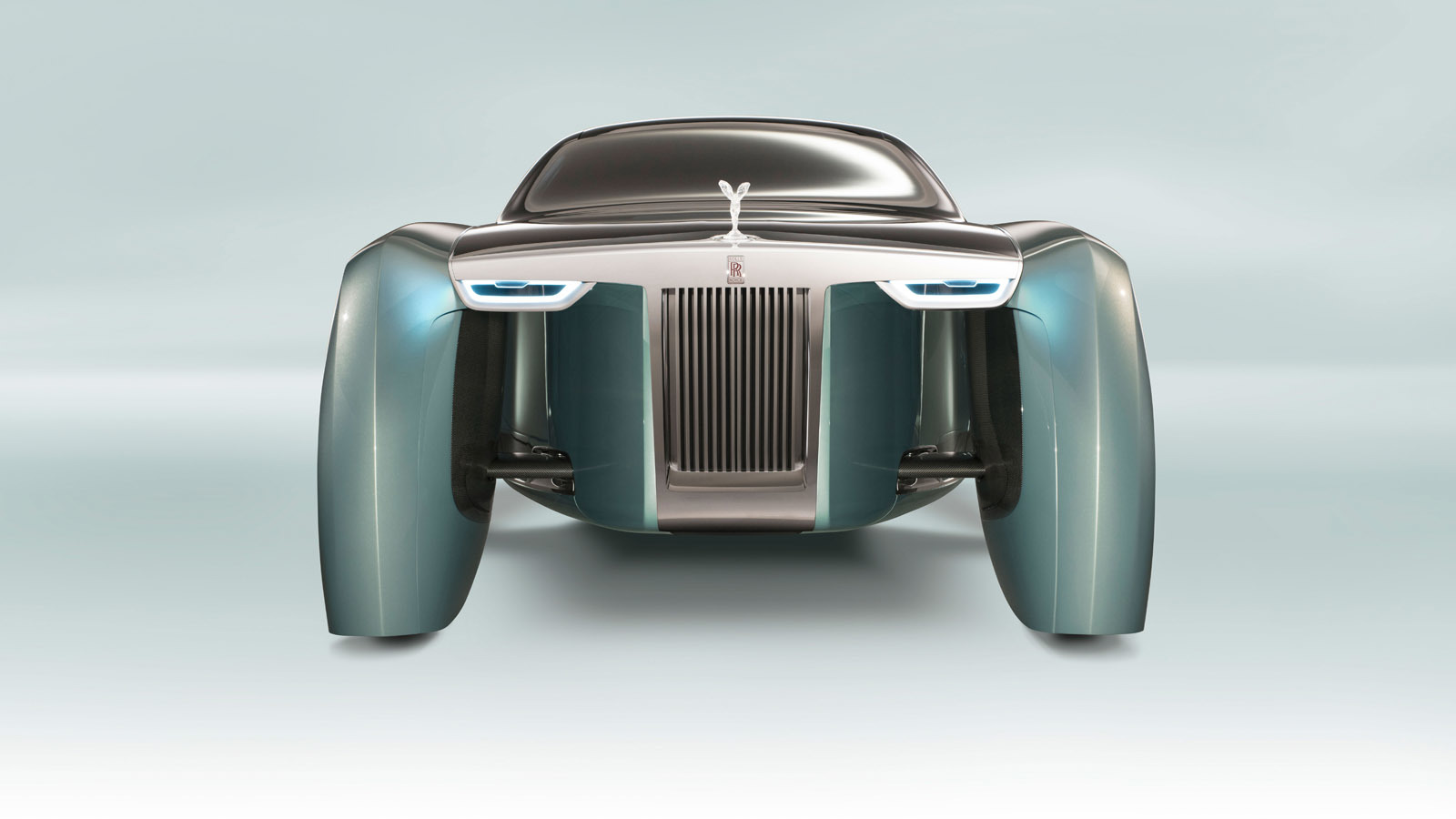 Destacan los emblemáticos faros flotantes y la verticalidad de su posición en complicidad con las defensas delanteras, todo ello inspirado en los primeros Rolls. La rejilla de la parrilla es cuadrada y plana, de un estilo contemporáneo, es verdaderamente el elemento distintivo de la marca. Finalmente, el vehículo cuenta con ruedas, lo que nos hace felices toda vez que parece extraído de los Supersónicos.
