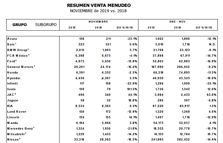 Al cierre de noviembre de este año se comercializaron 124,797 unidades, cifra 7.0% inferior a las unidades comercializadas en el mismo mes del año pasado. En el acumulado enero–noviembre 2019 se registraron 1,187,284 vehículos ligeros vendidos. Lo anterior representa una caída de 7.6% en relación con el mismo periodo del 2018 cuando al décimo mes del año se habían vendido 1,284,642 vehículos. La diferencia es de 97,358 unidades.