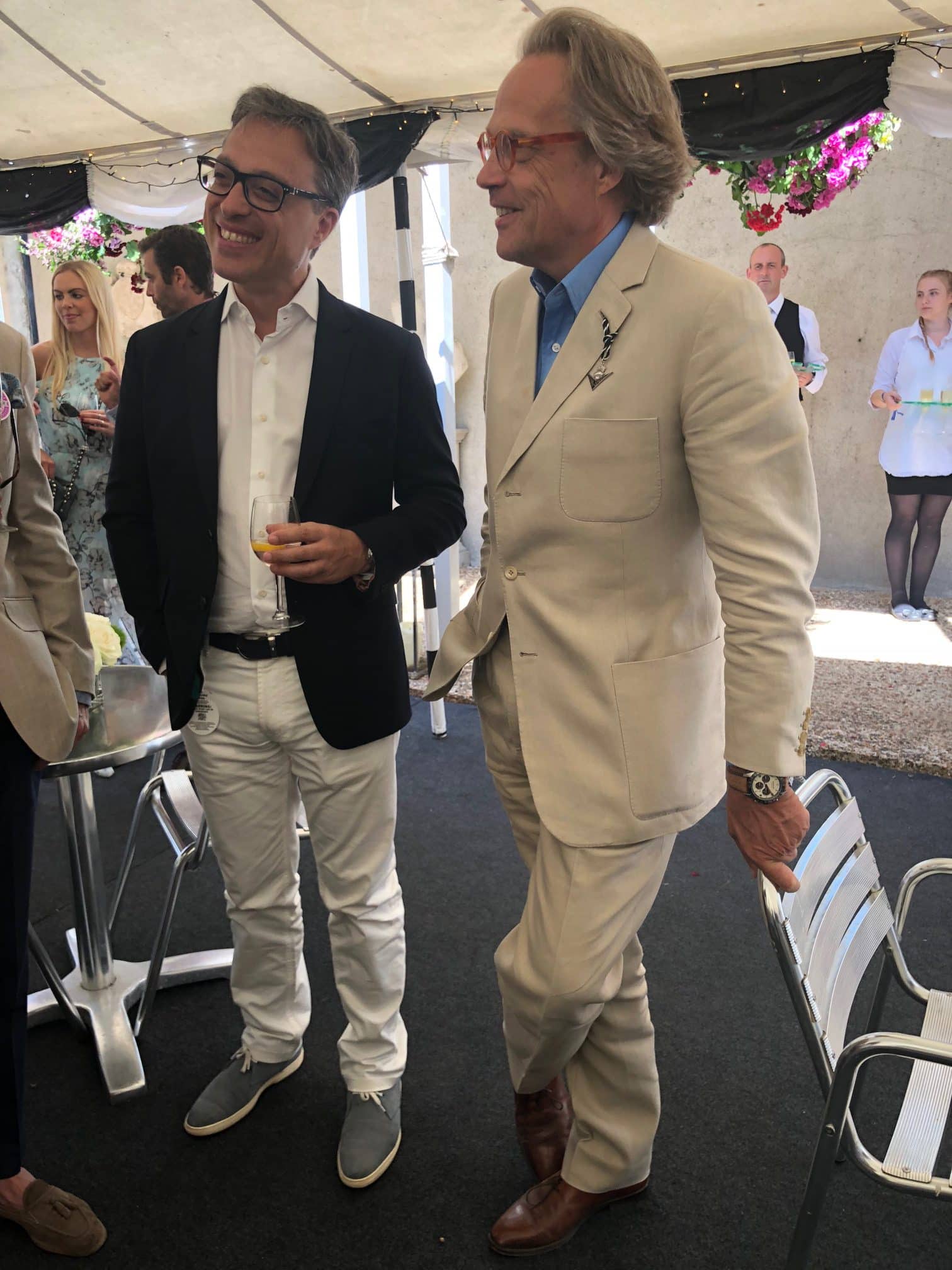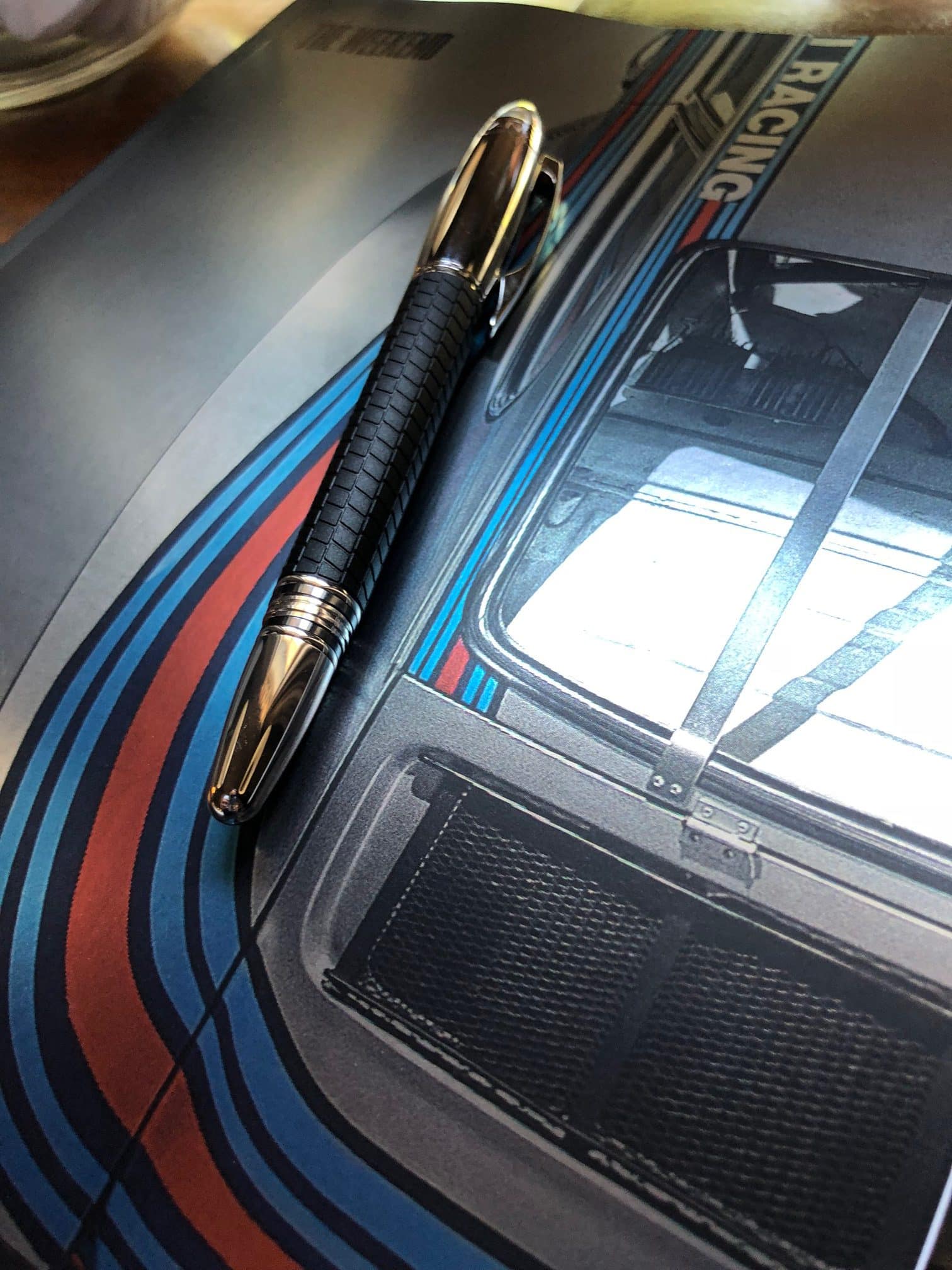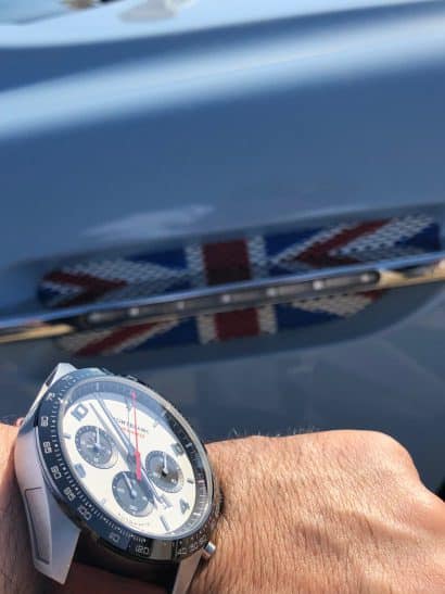 Por supuesto que en la muñeca un reloj Montblanc cronómetro, una pluma de la colección “Racing Spirit”, uniendo el mundo de los autos y de los relojes, en su vínculo natural “el tiempo”, uno contándolo y siendo su aliado exacto, otro tratando de romperlo en récords cada vez más pequeños. Así nos encontramos en el Festival de la Velocidad de Goodwood, a dos horas en carretera de Londres y en un paraíso natural, de paisajes y clima, de cielos estrellados y amaneceres tempranos con largas sombras formadas con el perfil de cerros y árboles.