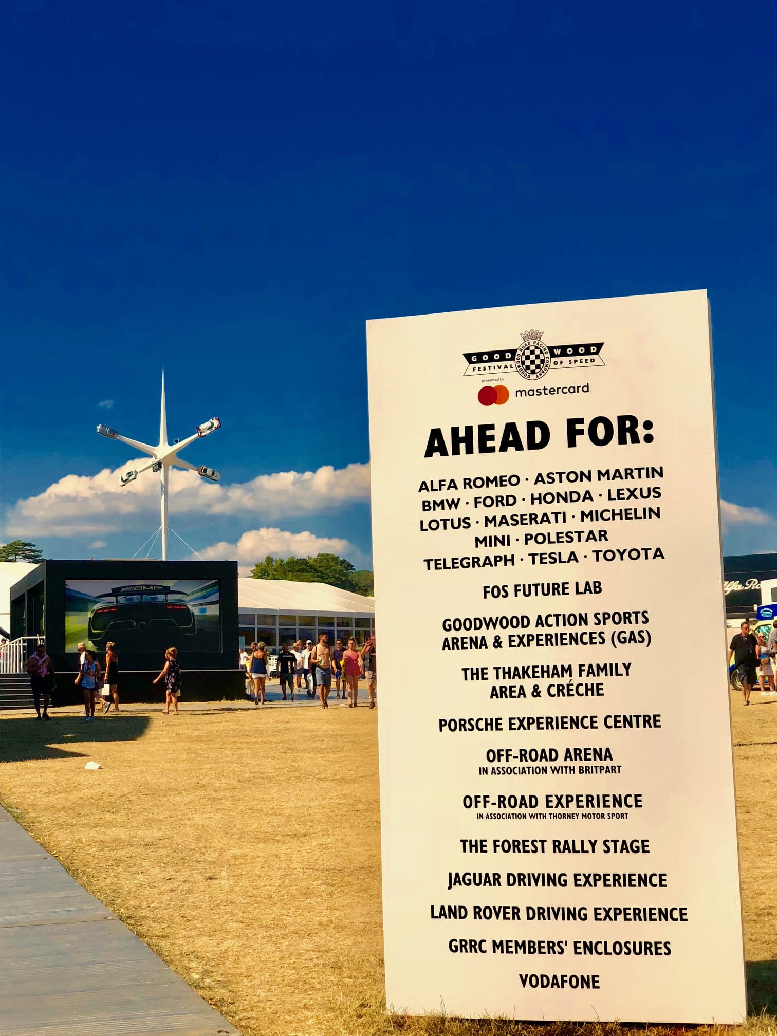 A la vista un escuadrón de aviones en el cielo haciendo las suertes más intrincadas y dejando estelas de humo de distintos colores se despiden haciendo un corazón de humo y flechándolo con uno de los aviones a gran velocidad, en tierra, una pista una cinta asfáltica sumamente angosta de subida que representa el reto más importante en el año para muchos de los que participan en las etapas cronometradas y para otros el simple hecho de correr en “Goodwood”, una Land Rover rompiendo el récord de velocidad con solo las dos ruedas izquierdas en el piso, en el ambiente una enorme escultura al centro de un lugar que podríamos llamar plaza central, que cada año nos asombra con sus formas y automóviles que están literalmente volando, paran los autos en la pista y al oído un fuerte estruendo y de repente un hombre sobrevuela con una chaleco “Jet Pack” a la multitud. Al caminar por las praderas aledañas se puede encontrar uno con la experiencia de manejo más impresionante de Jaguar, la fiesta de los 70 años de Porsche, el nuevo auto Polar 1 de Volvo envuelto en una caja de aire y metal, o de repente voltear y ver el Mustang Bullit original. En la mente una propiedad que no se puede dimensionar de tal extensión que tiene e intrincadas formas de colinas, montes, bosques y cuerpos de agua, dentro un aeródromo, un hipódromo, un circuito de carreras de autos, un campo de golf, distintos edificios como el central que es literalmente un Castillo, algunos otros que daban refugio a cazadores, mascotas y huéspedes en la propiedad, todo esto y más dentro de esta tierra que hoy es mítica para el deporte motor.