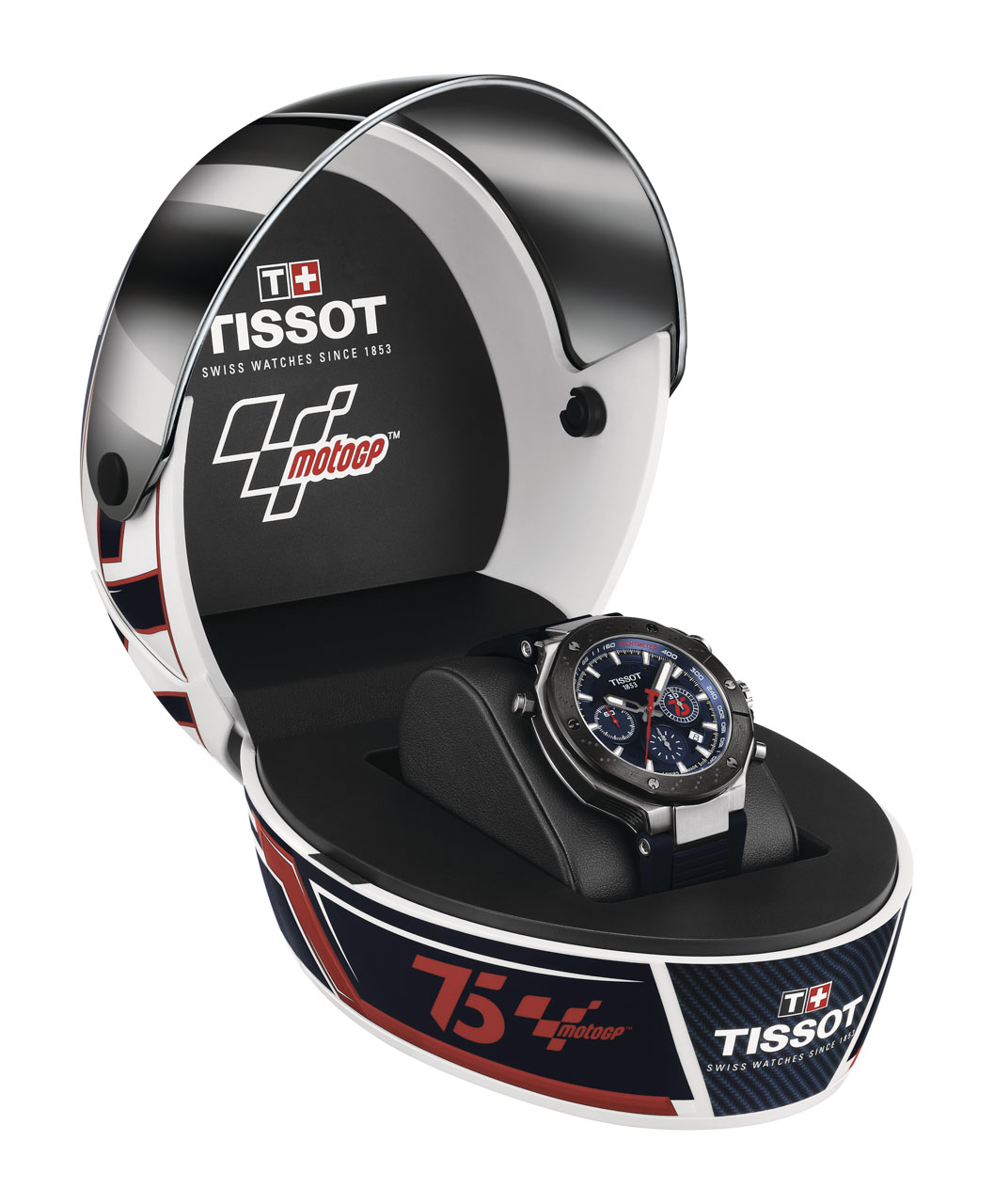 Con un movimiento automático Valjoux, en colores azul y rojo, el bisel de PVD negro en una nueva ejecución asemejando los discos de freno de las motocicletas, los pulsadores ahora emulan el manillar de la moto y con el número 75 en la subesfera del cronógrafo, el paquete esta completo y alcanza un nuevo nivel al entregarse en uno de sus memorables cascos, que este año también reviste un terminado especial en colores y escenas de MotoGP, con el respectivo 75 en las partes bajas del mismo.
