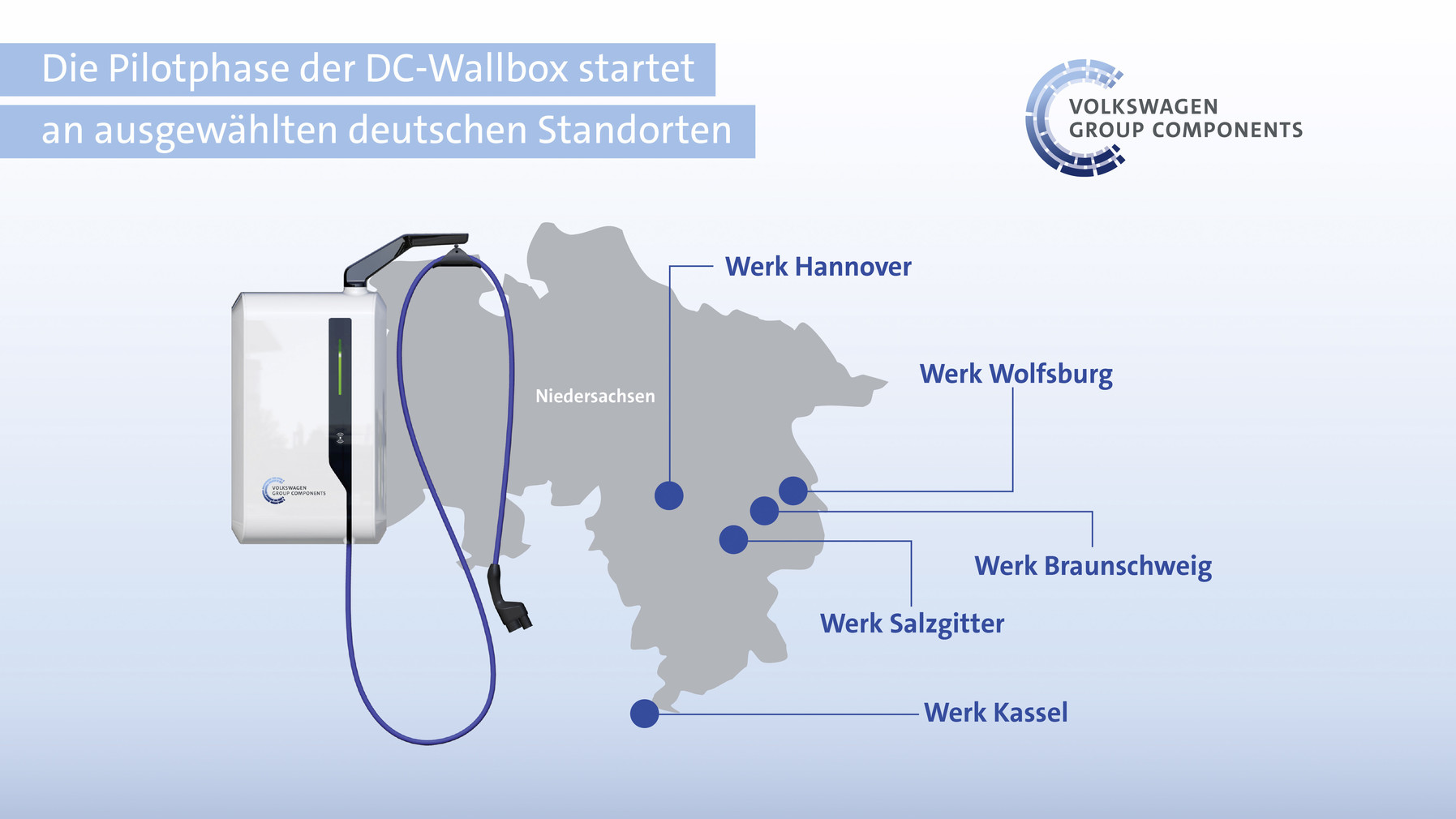 Volkswagen ha iniciado la fase piloto en sus propias fábricas en Wolfsburg, Braunschweig, Hannover, Salzgitter y Kassel con 20 dispositivos. Esto también significa que la infraestructura de carga existente se ampliará.